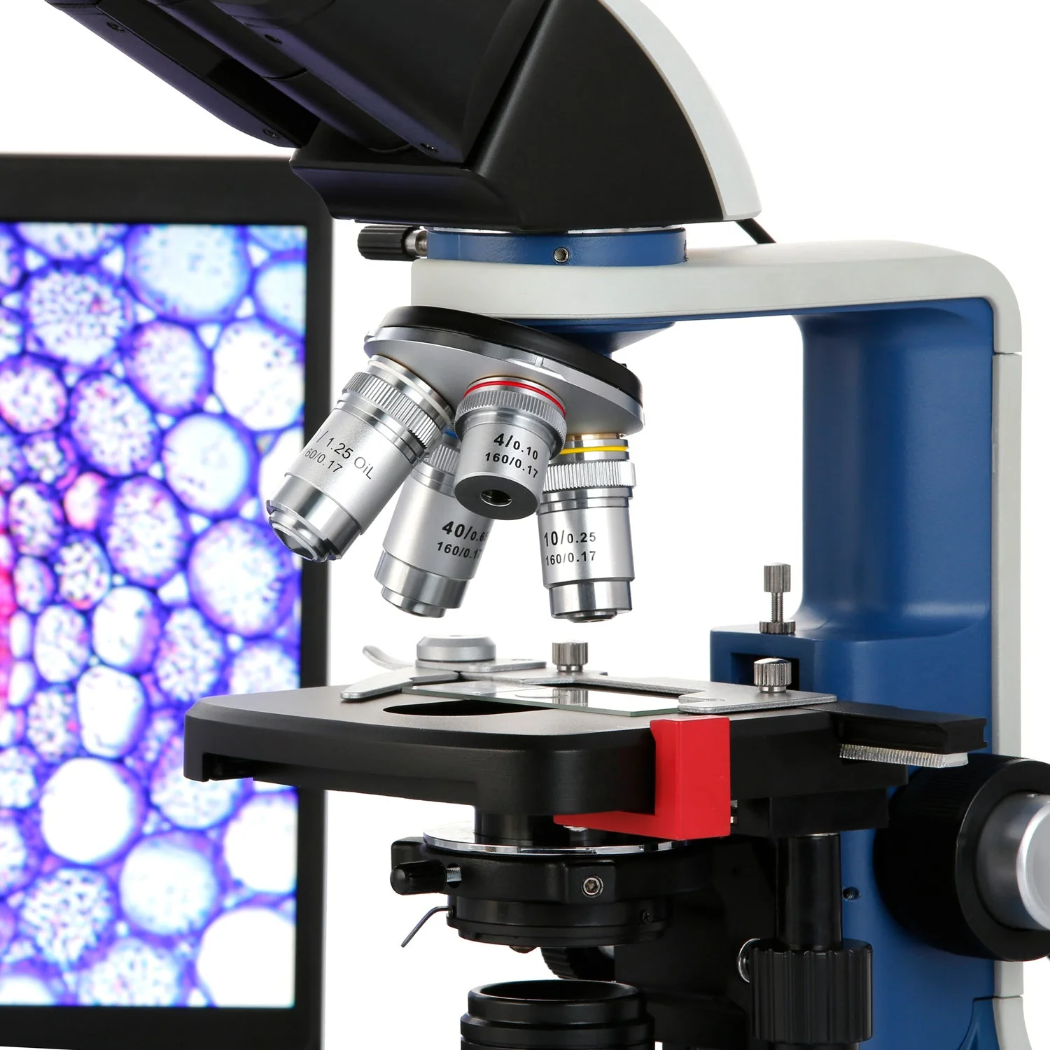 - Four objective lenses: 4X, 10X, 40X, 100X